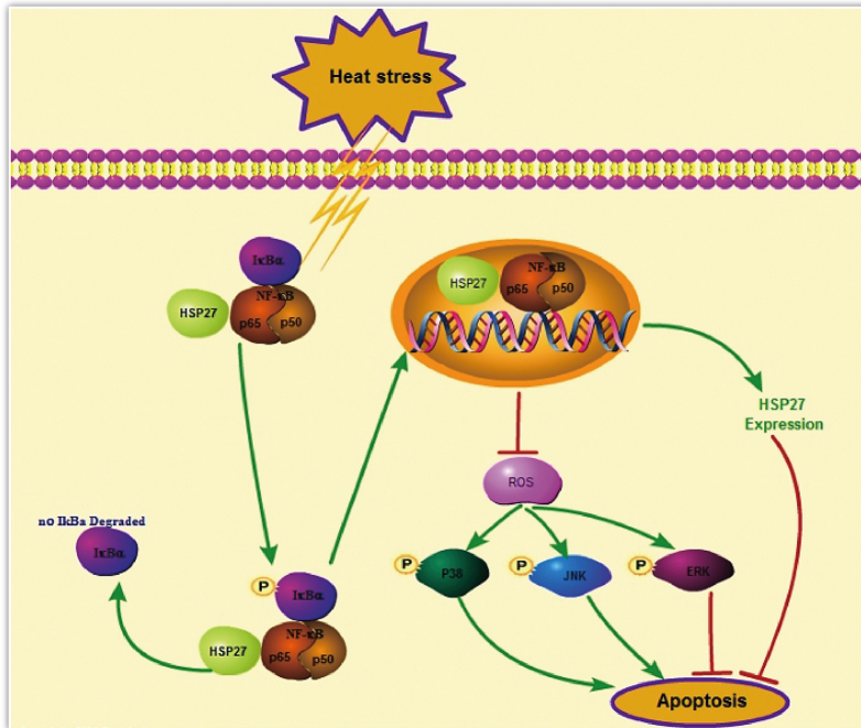 Cell apoptosis induced by heat stress is regulated by a complex signaling network. We previously reported that a p53-dependent pathway is involved. Here, we present evidence that NF-κB signaling plays a crucial role in preventing heat stress-induced early apoptosis. Human umbilical vein endothelial cells (HUVECs) were examined and increased phosphorylation of p65 and IκBα were detected, without IκBα degradation. When NF-κB signaling was inhibited by BAY11-7082, or a small interference RNA (siRNA) targeting p65, a significant increase in cell apoptosis and caspase-3 activity was observed, as well as reduced expression and translocation of HSP27 into the nucleus, an accumulation of reactive oxygen species, and prolonged phosphorylation of mitogen-activated protein kinases (MAPKs). In addition, an association between HSP27 and p65 was identified which may enhance NF-κB activation. When HSP27 was overexpressed, pretreatment of HUVECs with the antioxidant, apocynin, or N-acetyl cysteine, suppressed apoptosis. Similarly, inhibition of JNK and p38 with SP600125 and SB203580, respectively, also suppressed apoptosis, whereas siRNA-mediated HSP27knockdown and treatment with the ERK 1/2 inhibitor PD98059 did otherwise. In conclusion, these findings suggest a novel role for an NF-κB signaling pathway involving HSP27, ROS, and MAPKs that confers a protective effect against heat stress-induced cell apoptosis.
