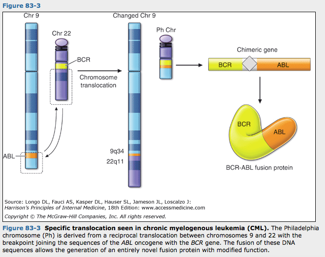 인체암에서 발견된 첫번째 재현가능한 염색체 이상은 만성 골수 백혈병에서 발견된 필라델피아 염색체였음. 이 세포유전학적 이상은 9번 염색체에서 티로신 활성효소인 ABL 종양유전자가 22번 염색체에 있는 BCR(breakpoint cluster region)에 근접하게 놓이게되는 상호 전위에 의해서 생김. 아래 그림은 전위 발생과 그로 인한 단백산물을 보여주고 있음. BCR-ABL 유전자 산물의 발현결과로 신호전달 경로가 활성화되어 정상적인 외부신호와 관계없이 세포성장이 일어남. 흥미롭게도 BCR-ABL의 활성도를 특이적으로 차단하는 약물이 만성골수 백혈병 환자에서 독성이 거의 없으면서 현저한 항암효능을 보임. 암에서 유전자 변화에 대한 지식은 기전에 근거한 항암제의 설계와 개발을 가능하게 하여 기대를 모으고 있음.