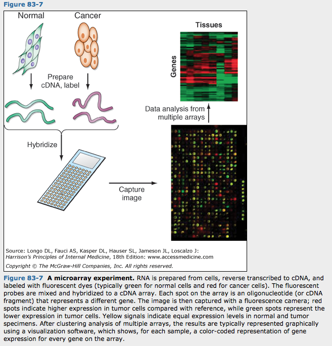 암발생 과정은 암유전자, 암억제 유전자, 후성변화에서 유전자 발현의 변화를 일으킴. 마이크로어레이와 염기서열결정과 같은 기술의 발전으로 암에서 다양한 유전자 발현을 동시에 분석하는 것이 가능해짐. 이로인해 암과 정상조직에서 수천개의 유전자 발현량을 동시에 측정할 수 있으며 그림 83-7에서는 암에서 진행적인 마이크로어레이 실험을 보여주고 있음. 전체 유전자의 발현 분석을 통해 암과 정상조직에서 차이가 나는 유전자를 규명할 수 있으며 복잡한 분자생물학적 기전을 이해하려는 노력이 가능해짐. 이러한 암의 분자 프로파일을 통해 다른 생물학적 행동을 보이는 암을 분류하고 암발생과 관련된 신호경로를 규명하여 암진단과 치료에 사용가능한 분자표적을 발굴할 수 있음.