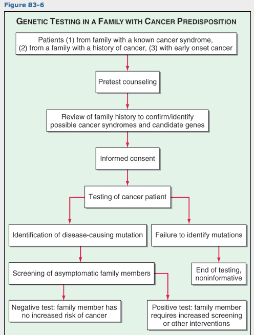 암감수성 유전자의 발견으로 암에 걸린 가족중 개인에서 암의 위험도를 예측하기 위한 DNA검사 가능성이 제기됨. 유전자 검사법을 이용하여 고위험 가족에서 암 위험도 평가와 의사결정에 관한 논리체게는 그림 83-6에 제시되어 있음.