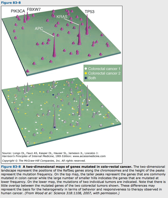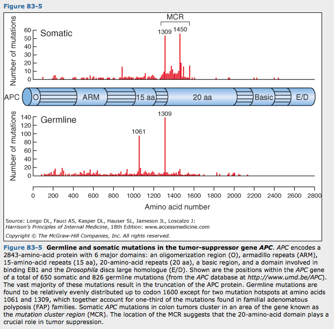 그림 83-5는 APC유전자에 발견되는 배선 및 체세포 돌연변이를 보여주고 있음.