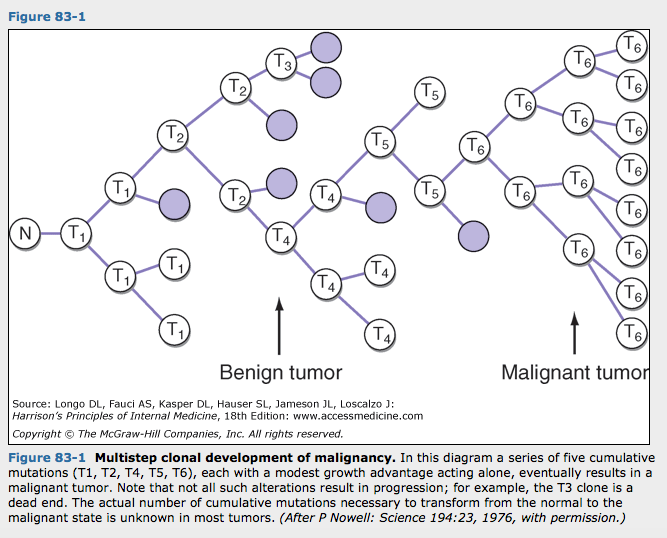 정상세포가 완전한 악성표현형으로 진행하는데는 다수의 누적돌연변이들이 필요함. 이 과정은 다윈의 미세진화에서 볼수 있는데, 각각의 연속적인 단계에서 돌연변이를 일으킨 세포들은 성장이점을 획득하여 그 인접부에 비해 크게 성장함. 아래 그림.