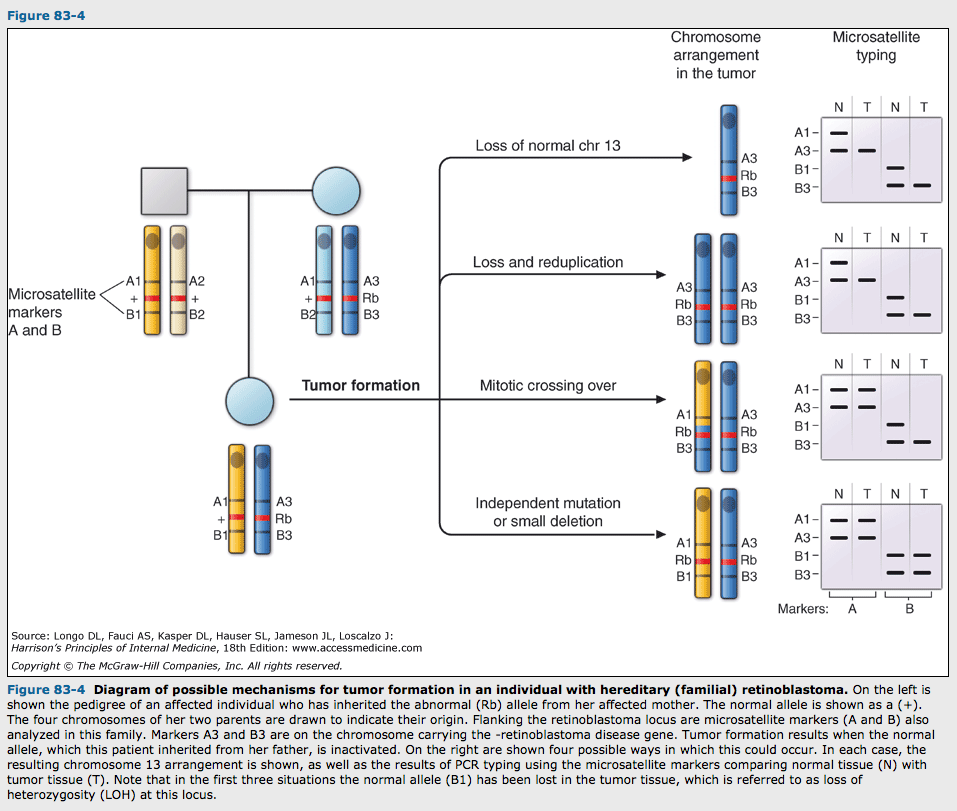 소수의 암은 유전소인이 있는 환자에서 발생함. 이들 가족에서 병에 걸린 개인은 종양억제 유전자나 한쪽 대립유전자에 기능상실 돌연변이의 소인을 가지고 있음. 이들 환자의 종양은 Knudson 가설에 따라 체세포 돌연변이(점돌연변이나 결손)의 결과로 남아있는 정상 대립유전자의 상실을 보여줌. 그림 83-4.