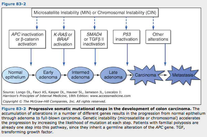결장 암종의 발생에서 진행성 체세포 돌연변이 단계 : 다수의 서로 다른 유전자 변화의 누적으로 정상상피가 샘종을 거쳐 완전항 상피암으로 진행함. 유전적 불안정(미세위성이나 염색체)이 각 단계에서 돌연변이 가능성을 증가시킴으로써 진행을 촉진함. 가족 폴립증이 있는 환자는 APC 유전자의 배선 돌연변이를 부모로부터 물려받음으로써 이 경로 중 이미 첫번째 단계임.