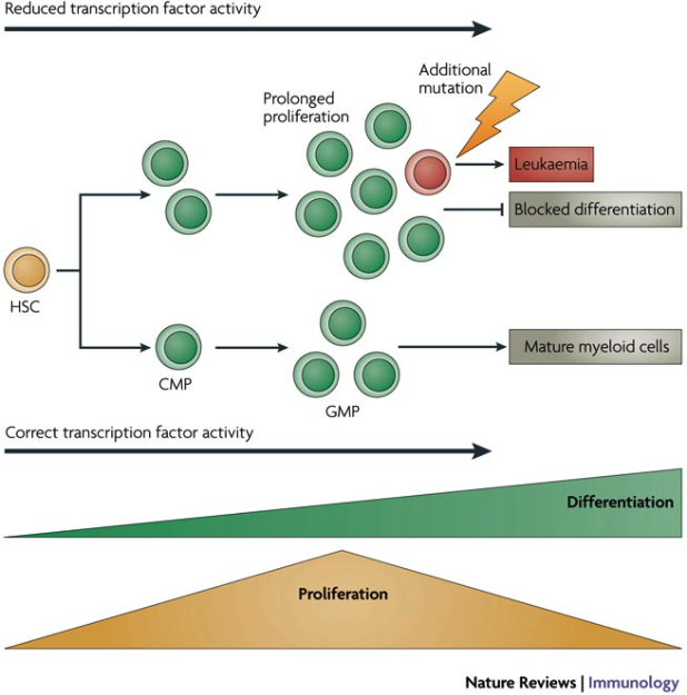 # 분화의 실패 : 최종분화단계전 시기에서 정지가 일어남. 줄기세포의 특징을 가질 수 있음(염색체 전위의 유전자 산출에 의해서 발달 프로그램이 전사억제로 인하여 백혈병에서 흔하게 관찰됨)