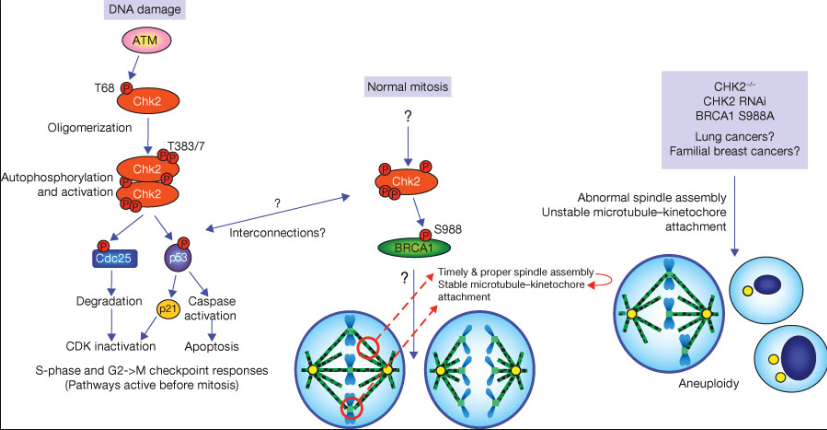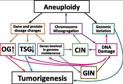 # 유전학적 불안정성 : DNA 수정신호전달경로의 결함에 의해 단일 또는 수개의 염기돌연변이(미세위성 불안정)가 유도되거나 보다 흔한 염색체 불안정에 의해 aneuploidy가 발생함. p53, BRCA1/2, DNA과도수정 유전자들의 기능소실에 의해 일어남