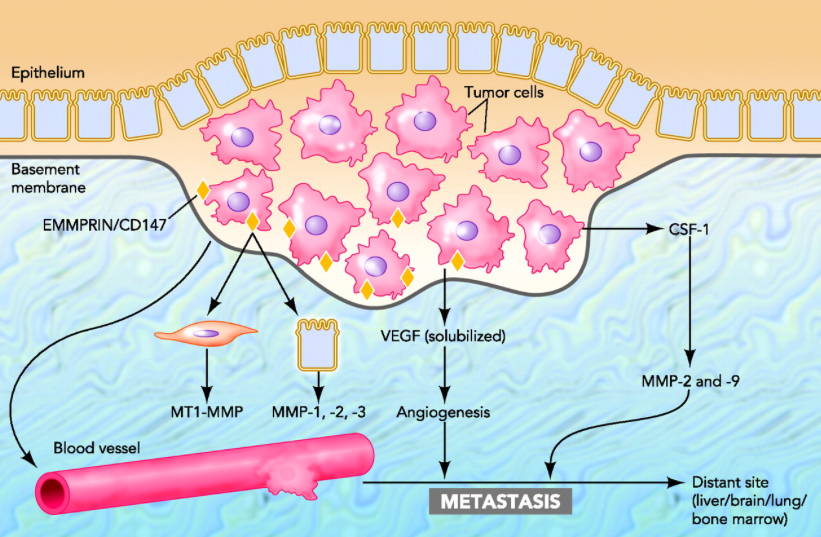 # 침습 : 세포-세포의 접촉소실(gap junction, cadherens)과 matrix metalloprotein-ase(MMPs)의 증가. 고정된 상피세포와 함께 상피세포에서 간엽세포로 이행되는 형태(EMT)를 취하며 보다 유동적인 섬유모세포처럼 변화함.