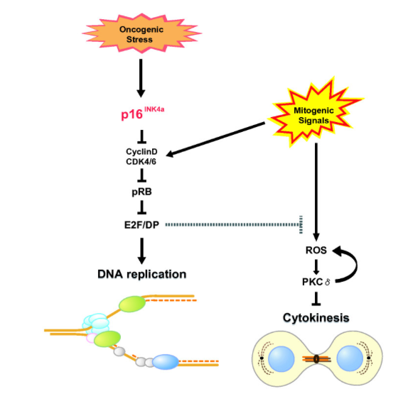# 조절되지 않은 세포증식 ; 음성조절자의 소실(종양억제 유전자 즉 Rb, p53), 양성조절자의 증가(종양유전자 즉 Ras, Myc) 비정상적인 세포주기 조절과 정상 확인점 반응의 소실이 일어남.
