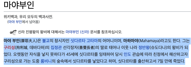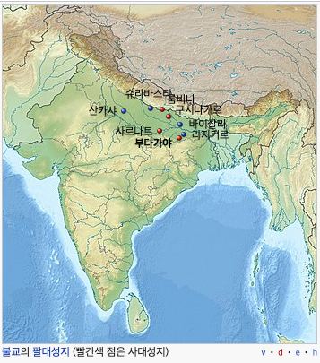 참고) 부다가야(힌두어: बोधगया)는 인도의 비하르 주 가야구역의 도시이다. 그곳은 석가모니가 보리수 나무 아래서 깨달은 장소로 유명하다. 인도 북동부 비하르(Bihar)주 가야(Gaya)시에서 11km 떨어진 곳에 있다. 탄생지 룸비니, 최초의 설법지 녹야원(사르나트), 열반지 쿠시나가르와 함께 불교의 4대 성지이다. 4대 성지는 부처가 열반하기 전에 제자 아난다에게 사람들이 참배할 4곳을 일러준 데서 유래하며 석가모니의 인생과 관련있다. 이 곳에 있는 마하보디 사원은 2002년에 세계유산이 되었다. 역사적으로는 그곳이 보디만다로 알려져 있었으며 대규모 불교사원의 정착지였다. 주된 불교사원은 보디만다-비하라로 불렸었으며, 지금은 마하보디 사원으로 불린다.