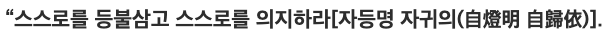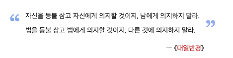 | “ | 자신을 등불 삼고 자신에게 의지할 것이지, 남에게 의지하지 말라. 법을 등불 삼고 법에게 의지할 것이지, 다른 것에 의지하지 말라. | ” |