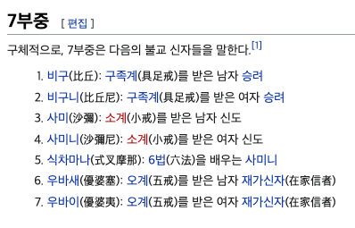 7부중(七部衆)은 모든 불제자(佛弟子)들, 즉 불교의 출가자와 비출가자(재가신자)를 망라하는 모든 불자들을 비구 · 비구니 · 사미 · 사미니 · 식차마나 · 우바새 · 우바이의 일곱 대중[衆]으로 분류하는 것을 말한다.[1] 7중(七衆) 또는 도속7중(道俗七衆)이라고도 한다. 7부중 가운데 비구 · 비구니 · 우바새 · 우바이를 통틀어 4부대중(四部大衆)이라고 한다.[5] 4부대중은 4부중(四部衆) · 4중(四衆) 또는 4부제자(四部弟子)라고도 하는데, 승단을 구성하는 근본 요소이다