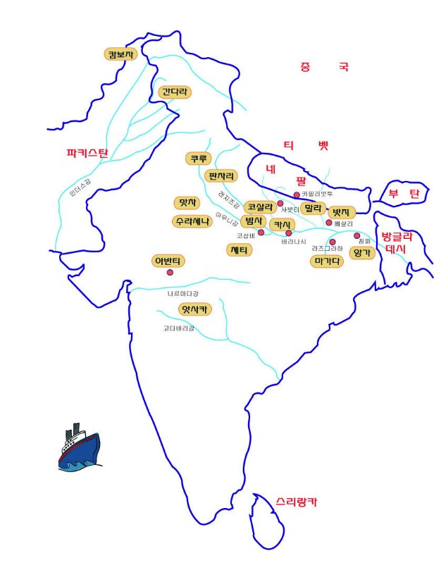 서북인도에 자리잡았던 아리안족은 점차 영역을 넓혀 동부내륙으오 세력을 확장. .. 기원전 6세기 경 대표적인 16국이 세력을 다툼.