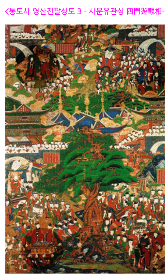 사문유관(四門遊觀)이란 그가 왕국의 동, 남, 서, 북의 네 문을 차례로 나가면서 각각 노인과 병자 그리고 죽은 자와 사문을 목격하게 되고 마침내 출가를 결심한 일을 말함.
