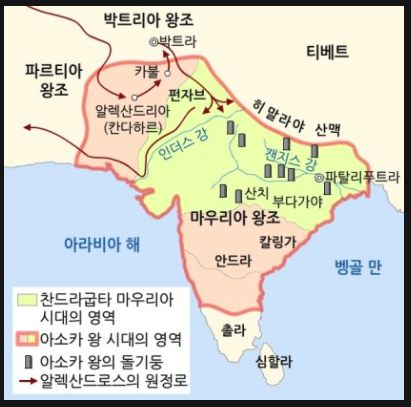 아소카왕은 현재까지도 인도인이 가장 좋아하는 성군으로 꼽히는 인물. 마우리아 왕조를 상징하는 '공작새'는 인도의 국조로 아소카왕이 붓다를 기념해서 첫 설법장소인 '바라나시'에 세운 아소카 석주의 머리장식은 인도를 상징하는 국장임.