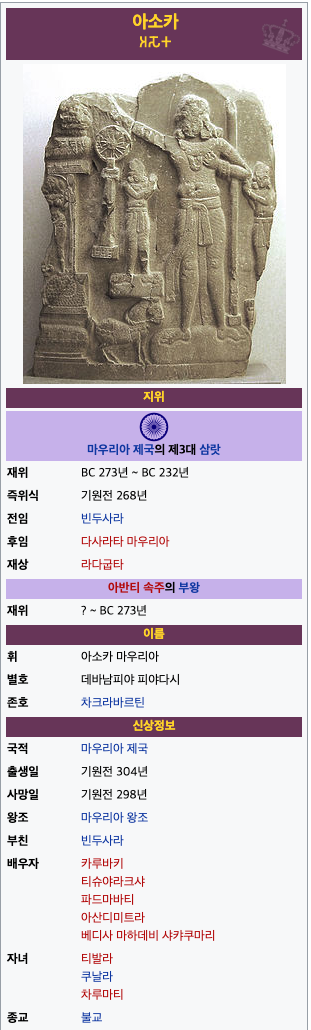 참고) 아소카(프라크리트어: 𑀅��𑁄𑀓, 산스크리트어: अशोकः 아쇼카)는 마우리아 제국의 제3대 삼랏이다. 인도 아대륙의 대부분을 통일함으로서 마우리아 제국의 전성기를 이끌었다. 찬드라굽타 마우리아의 손자이며, 인도에서 가장 위대한 삼랏의 하나로서 전륜성왕(samrāṭ Chakravartin)으로 인용된다. 아소카는 수많은 군사 정복뒤에 오늘날의 인도 대부분을 지배하였다. 아소카 시대 마우리아 제국은 지금의 파키스탄, 아프가니스탄과 서쪽 페르시아 제국의 일부, 동쪽으로는 인도의 아삼 주 남쪽으로는 미소레 주까지 세력을 넓혔다.