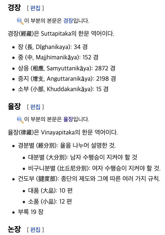 산스크리트어의 pitaka(한문 번역: 藏)는 '둥우리, 모음집'을 뜻하며, 고타마 붓다의 제자들이 고타마 붓다의 직접적 혹은 간접적 가르침을 모아서 그 성격에 따라 세가지 모음집으로 편성하여 'Tripitaka'(삼장(三藏))라 불렀다. 세친의 《섭대승론석》에 따르면 장(藏)은 '능히 포섭한다[能攝]'는 뜻으로, '마땅히 알아야 할 모든 의미[義]를 포섭한다'는 뜻이라고 말하고 있다.[1][2]