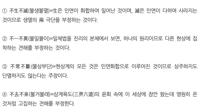 또한 연기법을 이해하는 새로운 방식으로 '팔부중도'를 제시함. 팔부중도란 모든 현상은 생하지도 멸하지 도 않고 단절되지도 항상하지도 않으며 같은 것도 다른 것도 아니고 오는 것도 가는 것도 아니라는 관점으로 연기를 이해하는 것임. .. 용수의 중도를 통한 이제의 통합은 언어를 초월하는 직관적인 초논리를 갖추었다고 할 수 있음. 이와같은 사상을 '연기=중도'의 관점을 중심으로 한다고 해서 '중관학파'라고 함.