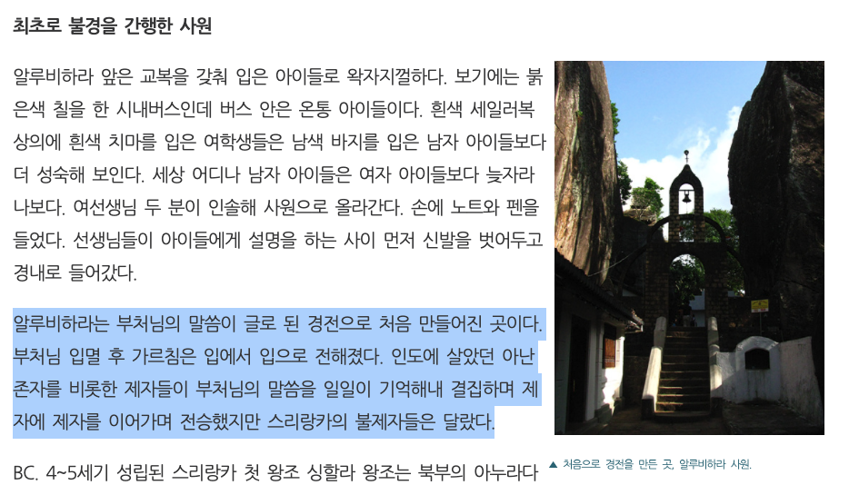 불교경전이 최초로 문자화된 곳은 인도가 아닌 스리랑카 마탈레에 위치한 '알루비하라 사원'이었음.