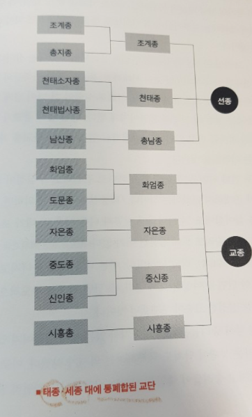 이후 세종은 7종파를 다시 통폐합하여 '조계종, 천태종, 총남종을 통합하여 선종'으로, '화엄종, 자은종, 중신종, 시흥종을 통합하여 교종'으로 축소함. 424개 사찰을 36곳으로 축소. 1429년에는 여자의 사찰출입을 금지
