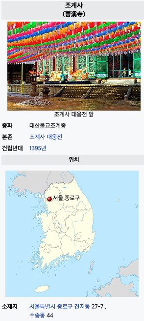 참고) 조계사(曹溪寺)는 조계종 절로 1395년에 지어졌다. 1910년에 승려들의 모금으로 설립된 각황사가 모태이다. 1938년에는 태고사가 설립되었고, 1954년에 조계사로 개칭되었다. 현재 조계사는 서울특별시 종로구 견지동에 위치한다.