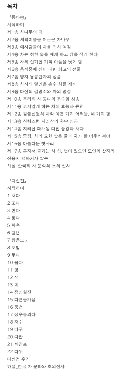 조선후기 승려 중 사상, 문화 양 방면에 걸쳐 두각을 나타낸 인물이 '초의 의순(1786-1866)임. 초의는 1830년 '다신전'과 1837년 '동다송'은 한국 차문화에 있어 금자탑같은 저술임.