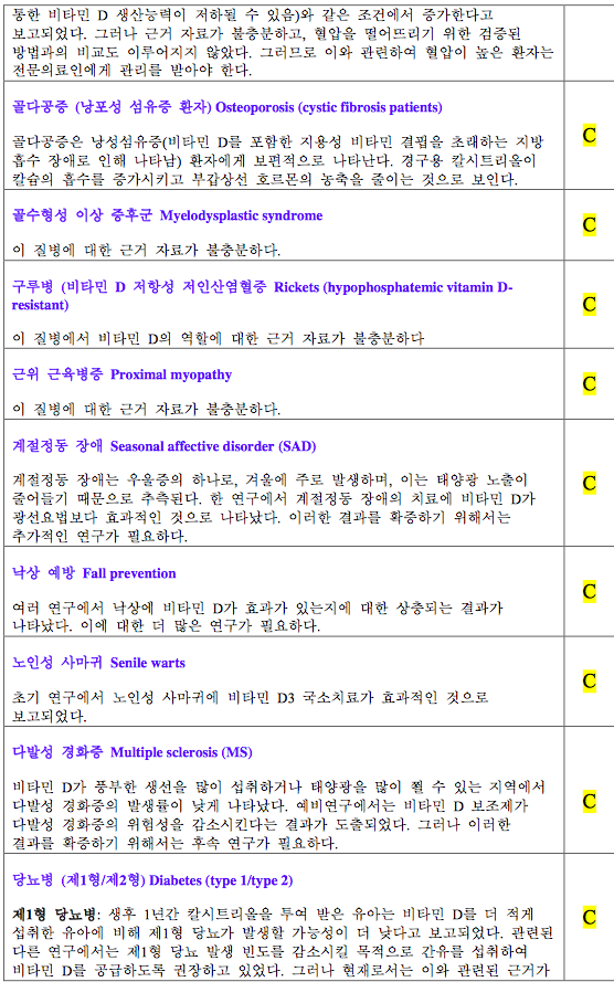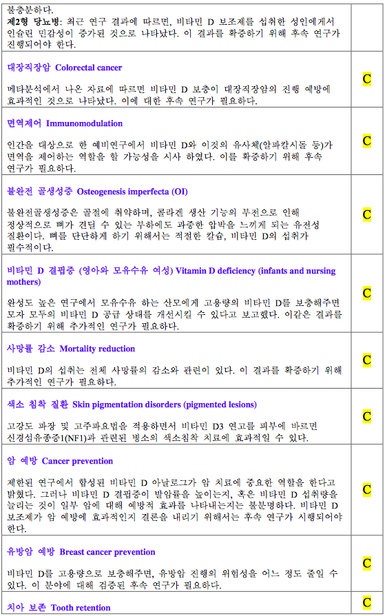 면역에 관여하는 세포는 대부분 비타민 D 수용체를 가지고 있어, 비타민 D가 면역조절기능을 가지는 것으로 추정된다. 관찰연구에서 비타민 D는 염증성 장질환[51], 다발성경화증[52] 등과 관련되어 있는 것으로 보이나, RCT로 증명되지는 못하였다. 비타민 D가 알레르기성 질환인 천식이나 습진과의 관련성을 살펴본 연구에서는 관찰연구에서도 결론이 일관적이지 않았다. 비타민 D와 감염의 관련성에 대한 연구들을 주로 결핵과 감기에 대해서 이루어져 왔다. 역사적으로도 항결핵제가 개발되기 전 결핵감염 시 햇볕을 쪼이면 결핵이 호전되는 것으 로 알려져 왔다. 7개의 관찰연구에 대한 메타분석[53]에서 는 활동성결핵 환자에서 건강대조군보다 혈중 비타민 D 농도가 낮은 것으로 관찰되었다. 하지만 소규모 RCT들[54,55] 에서는 결과가 일관적이지 않았다. 감기발생의 계절적인 변이가 감기와 비타민 D의 관련성에 대한 근거가 되지만, 소 규모 RCT들에서 모두 비타민 D 보충이 감기의 이환과 경과에 주는 영향은 일관적이지 않았다[56,57].