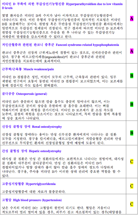 하지만 최근 몇 년 동안 비타민 D의 부족이 근골격계 이외의 문제를 일으킬 수도 있다는 사실이 관심을 받게 되면서 이에 대한 수많은 연구가 쏟아져 나오게 되었다. 하지만 연구에 따라 비타민 D의 효과 여부에 대한 일관성이 없고, 비타민 D 종류와 용량, 칼슘과 동반 투여 여부에 따라 다양한 결과를 보고되어, 여러 연구들을 종합적 으로 분석하여 평가하는 것이 필요하게 되었다. 그런 이유로 이번 리뷰에서는 비타민 D 대사, 생리작용, 비타민 D 급원과 섭취량, 상태 평가, 역학 등 비타민 D에 대한 이해와 골격계 와 비골격계 질환에 있어서 비타민 D 보충의 효과에 대해서 근거중심의학적인 방법론을 적용하여 평가하도록 하겠다.