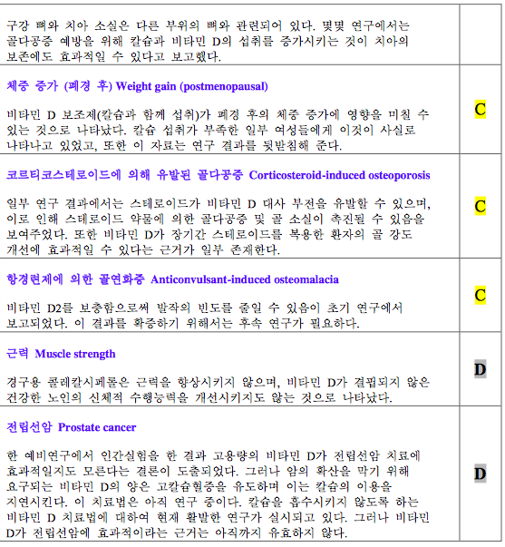 하지만 대규모 RCT인 WHI 연구에서는 칼슘과 비타민 D를 보충하였을 때 대장암과 유방암의 발생 위험을 줄이지 못하였다[42,43]. 실제로 USPSTF에서 비타민 D 보충과 암 발생 위험에 대한 RCT에 대해 메타분석한 결과에 따르면 암 발생 위험을 줄이지 못하였다[44]. 따라서 비타민 D의 암 예방에 대한 효능이 확립되어 있지 않은 반면, 장기복용에 대한 안전성 역시 확립되어 있지 않으므로 암 예 방을 위해 비타민 D 복용을 권유하기는 어렵다고 할 수 있다. 암 환자가 비타민 D를 보충한 25개 연구에 대한 메타분석에서 비타민 D 농도가 낮았던 일부 환자에서 예후가 나빴지 만 비타민 D를 보충하였을 때 환자에서 이득은 없었다. 현재까지 근거로 암 환자에서 비타민 D를 보충하도록 권고하 는 것에는 근거가 불충분하다고 할 수 있다[45].