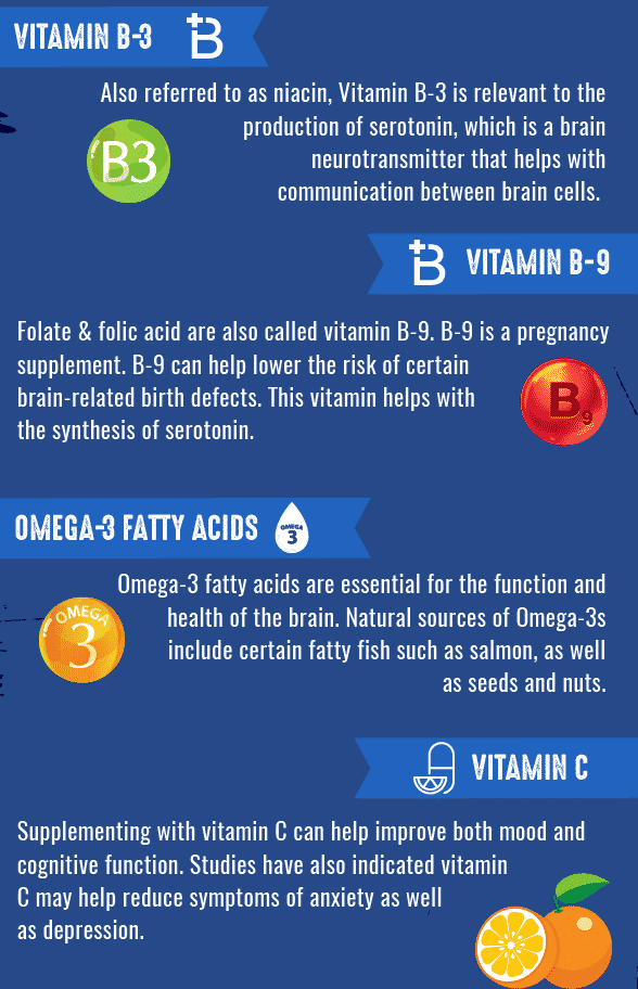 • Vitamin B-3. Also referred to as niacin, Vitamin B-3 is relevant to the production of serotonin, which is an important brain neurotransmitter that helps with the communication between brain cells. In people with depression, serotonin levels may be low. If someone has a deficiency of vitamin B3, they may see a negative effect on their mood. For people with depressive symptoms, a dose of 20 mg of B-3 each day can be helpful.
