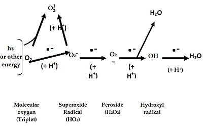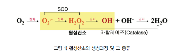 활성산소(reactive oxygen species, ROS)는 산소(O2)가 4개의 전자를 받으면서 독성이 없는 H2O를 만드는 도중에 생겨나는 부산물이다. 즉, 산소가 전자를 한개 받으면 superoxide anion(O2-.)를 구성하는데 이 물질은 매우 불안정하여서 효소(superoxide dismutase, SOD)의 작용에 의하여 H2O2(hydrogen peroxide, 과산화수소)를 생성한다(그림 1).