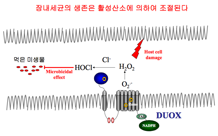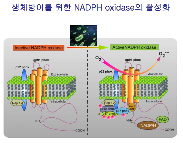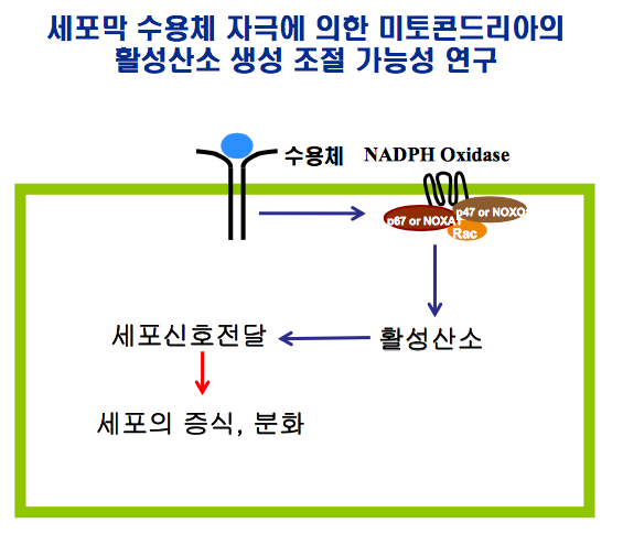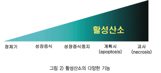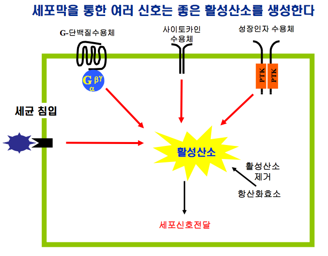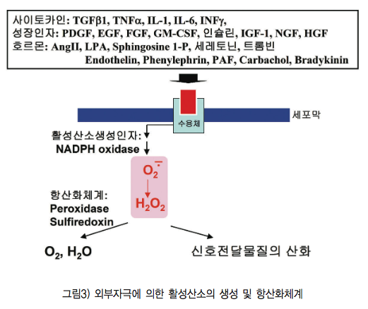 최근에 많은 연구에 의하면 활성산소(reactive oxygen species, ROS)는 단순히 호흡과정에서 생성되는 부산물이 아니라, 외부자극에 의하여 세포막에 존재하는 수용체를 통하여 일시적으로 생성되는 세포신호전달체계상의 이차 신호전달물질(second messenger)로서 작용할 것이라는 연구결과가 나오고 있다. 즉, 병리적인 상태의 다량의 활성산소는 세포내에서 독성물질로 작용하지만 외부신호에 의하 여 특정 지역에서 일시적으로 생성되는 낮은 농도의 활성산소는 세포의 성장, 사멸과 더불어 면역등의 세포기능을 조절하는 새로운 개념의 세포 내 이차신호전달물질이다 (그림 2).