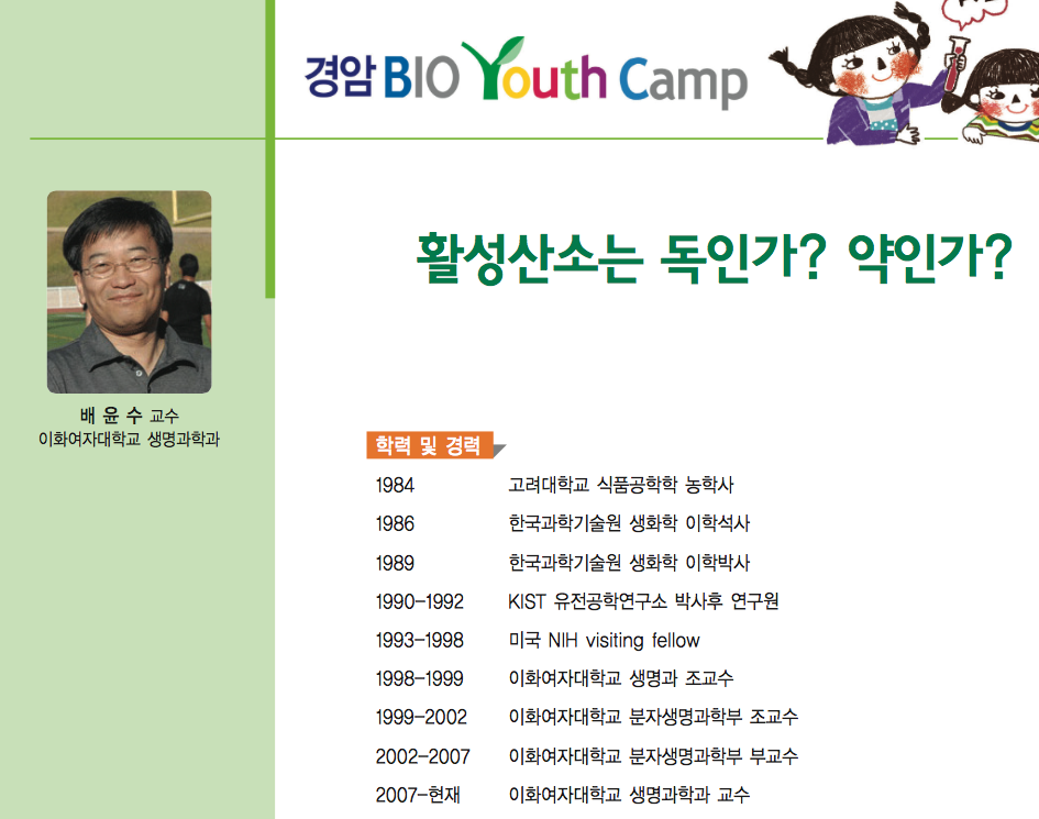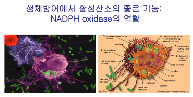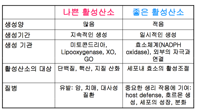 활성산소는 세포내에서 그 생성양의 조절에 따라서 좋은 활성산소와 나쁜 활성산소로 구분되며 이는 긍극적으로 인체의 질병과 연관성이 깊다. 본 강의에서는 두 가지 활성산소의 기능에 대하여 토의하고자 한다.