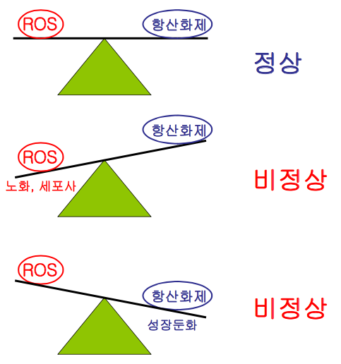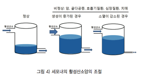 세포내에서 활성산소는 생성과 소멸의 균형에 의하여 일정 소량의 활성산소의 양이 존재하고 이를 통하여 다양한 세포내의 생리적인 현상을 유도한다. 그러나, 생성체계의 과발현 및 소멸체계(항산화체계)의 돌연변이등을 통한 비정상상태가 유발되면 세포내의 활성산소의 양이 증가되면 다양한 병리현상(암, 골다공증, 심장질환, 호흡기질환, 치매)을 유발하게 된다 (그림 4).