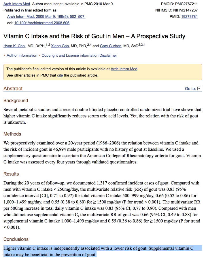 - 비타민 C는 요산을 소변으로 배출시킴.