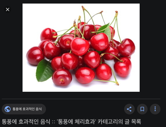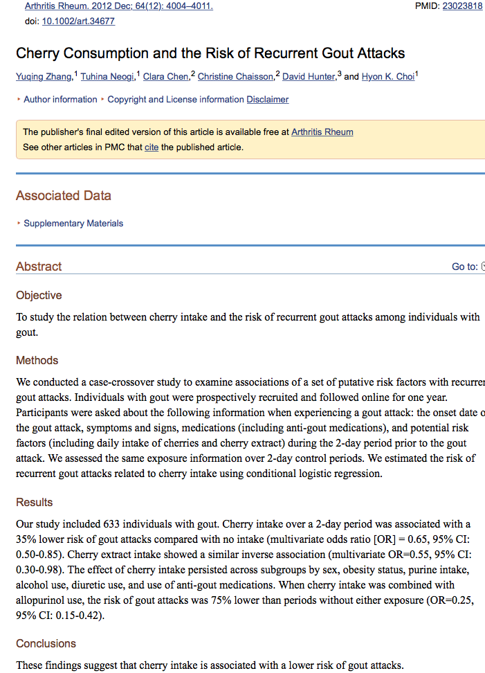 - 체리 또는 체리주스를 매일 먹었을때 요산농도가 내려가고 통풍발작도 줄어듬.