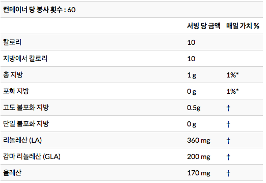 - 감마리놀렌산은 오메가 6지방산의 하나로 인체내 합성이 불가능하여 반드시 식품으로 섭취해야 하는 필수지방산.