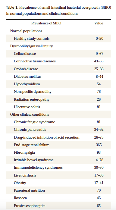최근 이와 관련된 한 메타분석 논문을 보면 과민성 장증후군에서 소장내 세균 과증식의 유병률이 4–64%에 이르는 것으로 보였다.7) 이러한 유병률의 차이는 검사방법 및 양성기준의 차이에 기인한 것으로 보이는데, 이 논문에서 12개의 여러 연구결과들을 분석한 결과 과민성 장증후군에서 소장내 세균 과증식의 양성이 3배에서 5배 높다는 결과가 도출되었다. 그러나 가장 낮은 양성률을 보인 진단기준을 사용했을 때에는통계적인 의미를 보이지는 못했다.8,9) 또한 연구들 간의 이질성 및 작은 규모의 연구대상자와 출판 편견(publication bias) 등을 고려한다면 소장내 세균 과증식의 유병률은 과대 평가될수 있음을 알아야 하겠다.