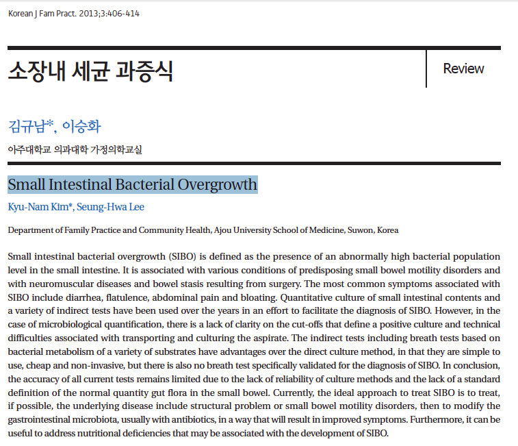 소장내 세균 과증식은 말그대로 소장에 세균의 수가 과증식되는 것을 말하며 그 원인은 다양한 것으로 되어있다. 소장내 세균 과증식은 한 가지 소화기 증상만을 보이는 경우에서부터 다양한 소화기증상까지 있을 수 있어 전통의학으로 접근 시 단순한 기능성 소화기질환으로 간과될 수도 있다. 따라서 기저질환이 없음에도 불구하고 소화기 관련 증상을 호소한다면 이런 환자에게 가정의나 일차의료인은 소장내 세균과증식을 의심하여 호기검사나 치료시도 접근방법을 해보는 것이 도움이 될 수 있을 것이다.