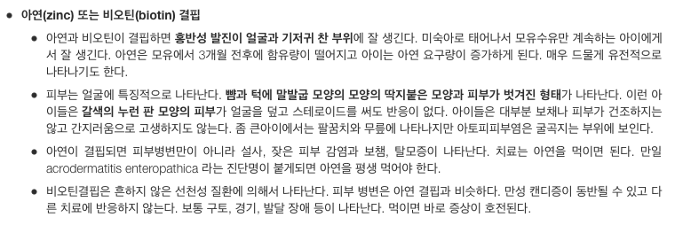 눈, 코, 입술주위와 사지에 지루성, 홍반성 발진이 생김.