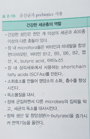 - 섬유소가 풍부한 음식은 유산균의 먹이를 제공함. 장기능 향상, 미네랄 흡수 증가, 대장암 위험 감소의효과가 있음.