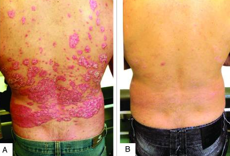 Figure 8. Photographs of two male patients with psoriasis before (A and C) and after (B and D) six months of treatment with vitamin D (35,000 IU per day). (A and B) A 59 y-old patient with BMI of 24.8 presenting a PASI score of 31 before treatment and achieving score of 18.2 after six months of treatment; his serum concentration of 25(OH)D3 was 22.8 ng/mL at baseline, reaching 127.5 ng/mL after 6 mo of treatment. (C and D) 60 y-old patient with BMI of 33.6 presenting a PASI score of 40.4 at baseline, achieving score of 12.4 after six months; his serum concentration of 25(OH)D3 was 5.6 ng/mL, reaching 103.2 ng/mL after six months of treatment.