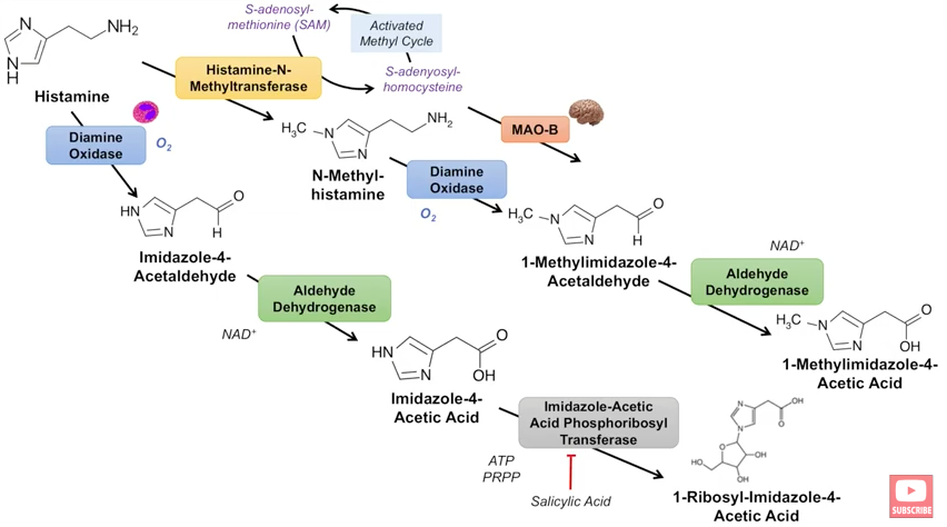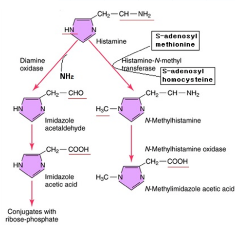 - 세포외 혈액과 위장관에서는 DAO(diamine oxidase)로 대사되어 히스타민의 작용이 사라지고 세포내에서는 NMHT(N-methylhistamine trasnferase)라는 효소에 의해 히스타민이 분해됨