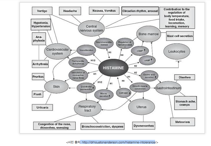 - 만약 이런 대사과정에 문제가 발생하면 히스타민은 분해되지 않은 채 계속 인체에 영향을 줌.