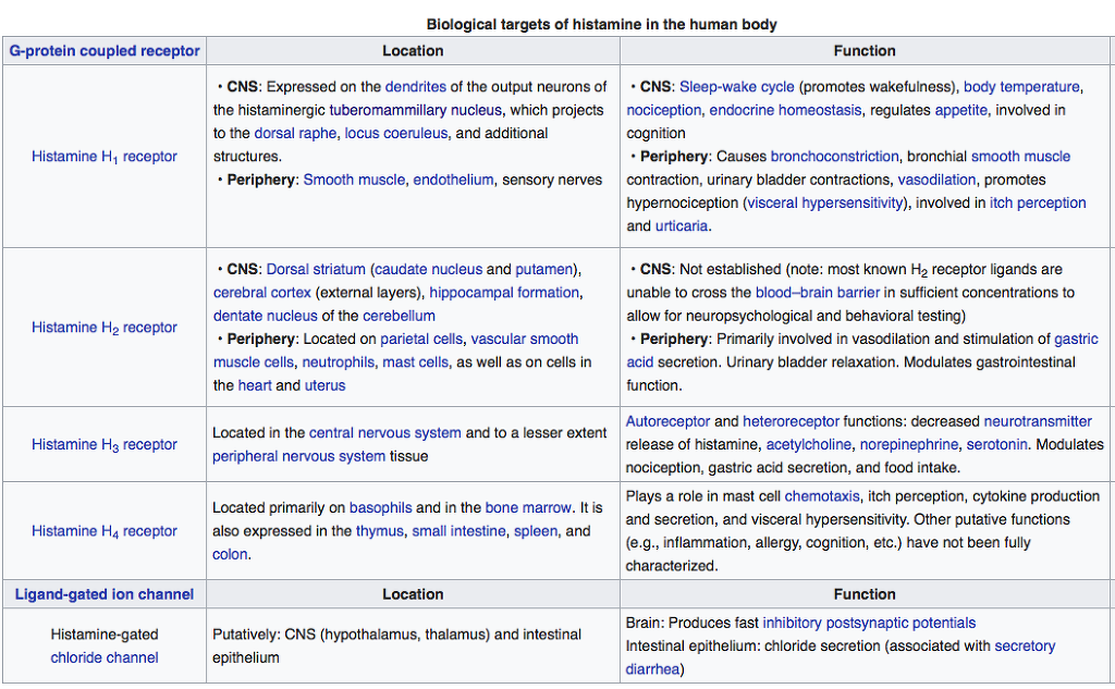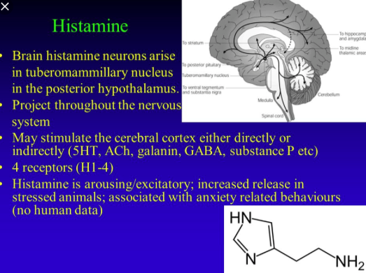 - 뇌중추에는 TMN(tuberomammilary histaminergic nucleus)이라고 하는 히스타민성 신경핵이 자리하고있음. 이는 뇌의 각성작용이나 기억과 관련이 있음. 히스타민의 각성작용은 도파민처럼 자극적 각성이 아닌 정적인 깨어있음(calm wakefullness)에 관여함.
