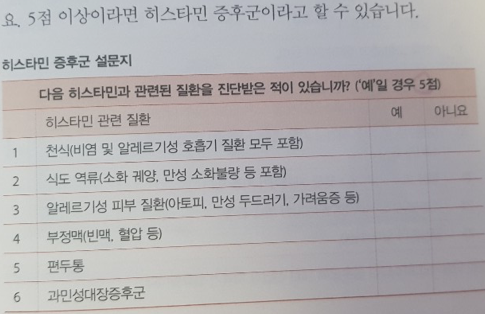 - 5점이상이면 히스타민 증후군 진단과 치료가 필요함.