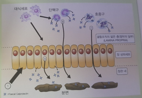 - 대장염증(크론병)에서 대장 염증을 평가하는 칼프로텍틴(fecal calprotectin)검사. 대변 칼프로텍틴은 장에 염증이 발생하면 호중구가 장 점막으로 이동하는 성질을 이용하여 진단에 활용하는 것인데 호중구 세포질에 있는 가용성 단백질의 60%를 차지하므로 염증성 장질환의 진단과 추적검사에 이용함.