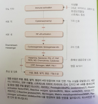 - 염증반응은 부종, 통증, 발적, 열감 4대 반응이며 이로 인한 기능소실을 유발함. 세균이나 바이러스, 외부 이물질, 스트레스에 의하여 자극되면 전사인자인 NF-kB를 통해(단백질 합성) 염증유발 물질인 히스타민, 세로토닌, 프로스타글란딘, 류코트리엔, PAF, ROS, Nitro oxide, 사이토카인, 케모카인, CRP, 피브리노겐, MMP(metalloproteinase), plassmiongen activation inhibitor를 합성하여 염증반응을 일으킴. 히스타민은 이런 인자 중의 하나임.