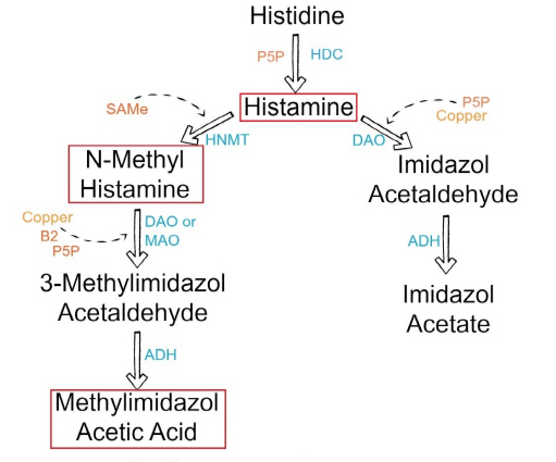 - 히스타민은 조직내에서 주로 분비되므로 매우 중요한 효소임. 이 효소는 SAMe(S-adenosyl-L-methionine)으로부터 메틸기를 받아 인체에서 충분히 임무를 수행한 히스타민의 활동성을 억제함. 이 효소는 세포내에서 작용하기 때문에 혈중에서 직접 측정이 불가능함.