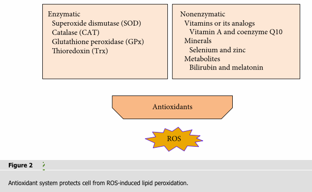 Antioxidants can counteract free radicals and neutralize oxidants. The general endogenous antioxidant system consist of (1) enzymatic antioxidants like superoxide dismutase (SOD), catalase (CAT) and glutathione peroxidase (GPx), and thioredoxin (Trx); and (2) nonenzymatic antioxidants that include vitamins or its analogs (vitamins A, C, and E; coenzyme Q10; and flavonoids), minerals (selenium and zinc), and metabolites (bilirubin and melatonin) (Figure 2).