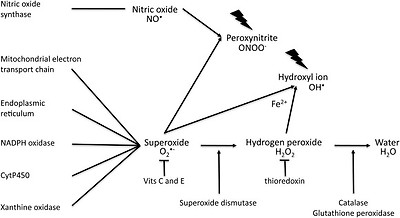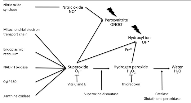 Excessive generation of superoxide can also lead to interactions with nitric oxide (NO